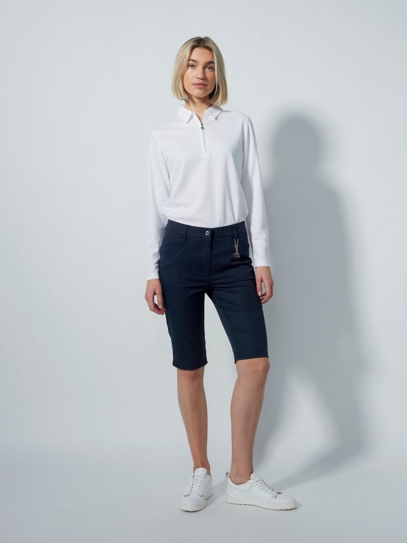 Die LYRIC V2 Bermuda Shorts von Daily Sports in edlem Navy bieten dir die perfekte Kombination aus stilvoller Optik, funktionalen Materialien und herausragendem Tragekomfort. Mit einer klassischen 60 cm Innenbeinlänge und einem schlanken, femininen Schnitt sind diese Shorts ein echtes Must-have für den Sommer – auf dem Golfplatz ebenso wie in der Freizeit.