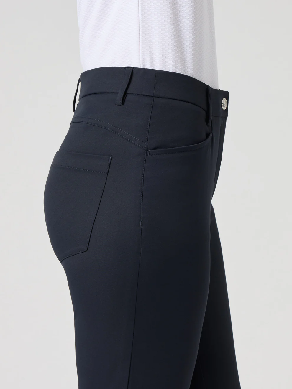 Der elastische Bund garantiert eine bequeme Passform, während praktische Taschen vorne und hinten ausreichend Platz für Scorekarte, Tees oder kleine Accessoires bieten. Außerdem ist das Material knitterarm und bügelfrei, was die Hose besonders pflegeleicht macht.