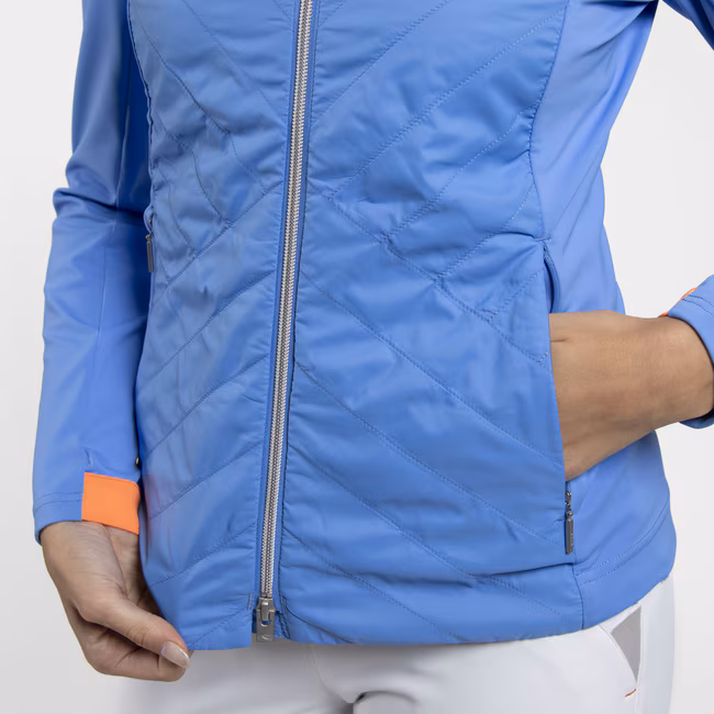 Die KJUS Retention Hooded Jacket für Damen in Yonder / Papaya Glow kombiniert funktionale Wärme mit einem sportlich-modernen Look. Sie ist die ideale Begleiterin für kühle Tage auf dem Golfplatz oder in der Freizeit und bietet eine perfekte Balance aus Isolation, Komfort und Bewegungsfreiheit.