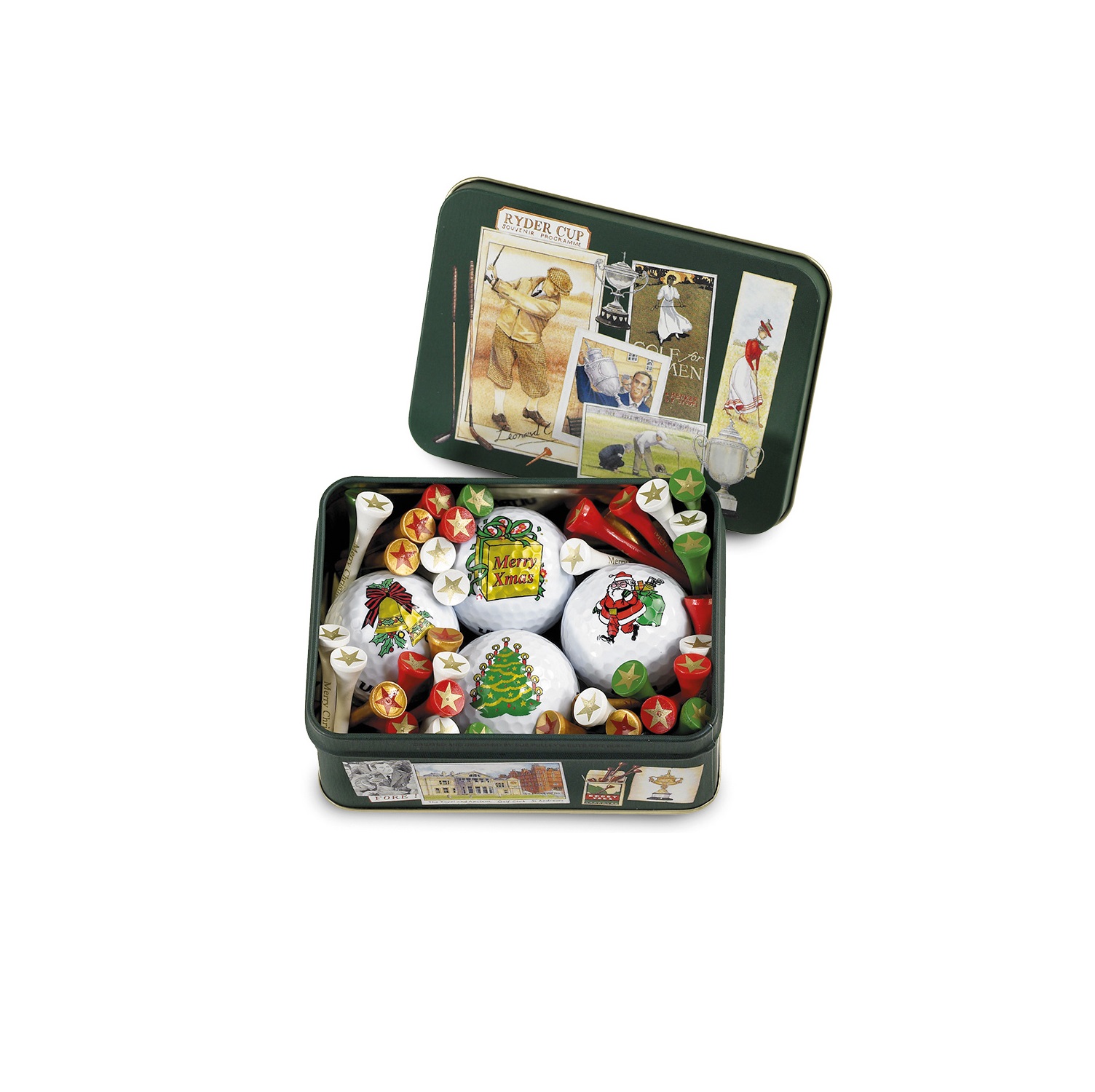In der Dose sind ca. 50 weihnachtliche Tees und 4 Golfbälle mit Weihnachtsmotiv.